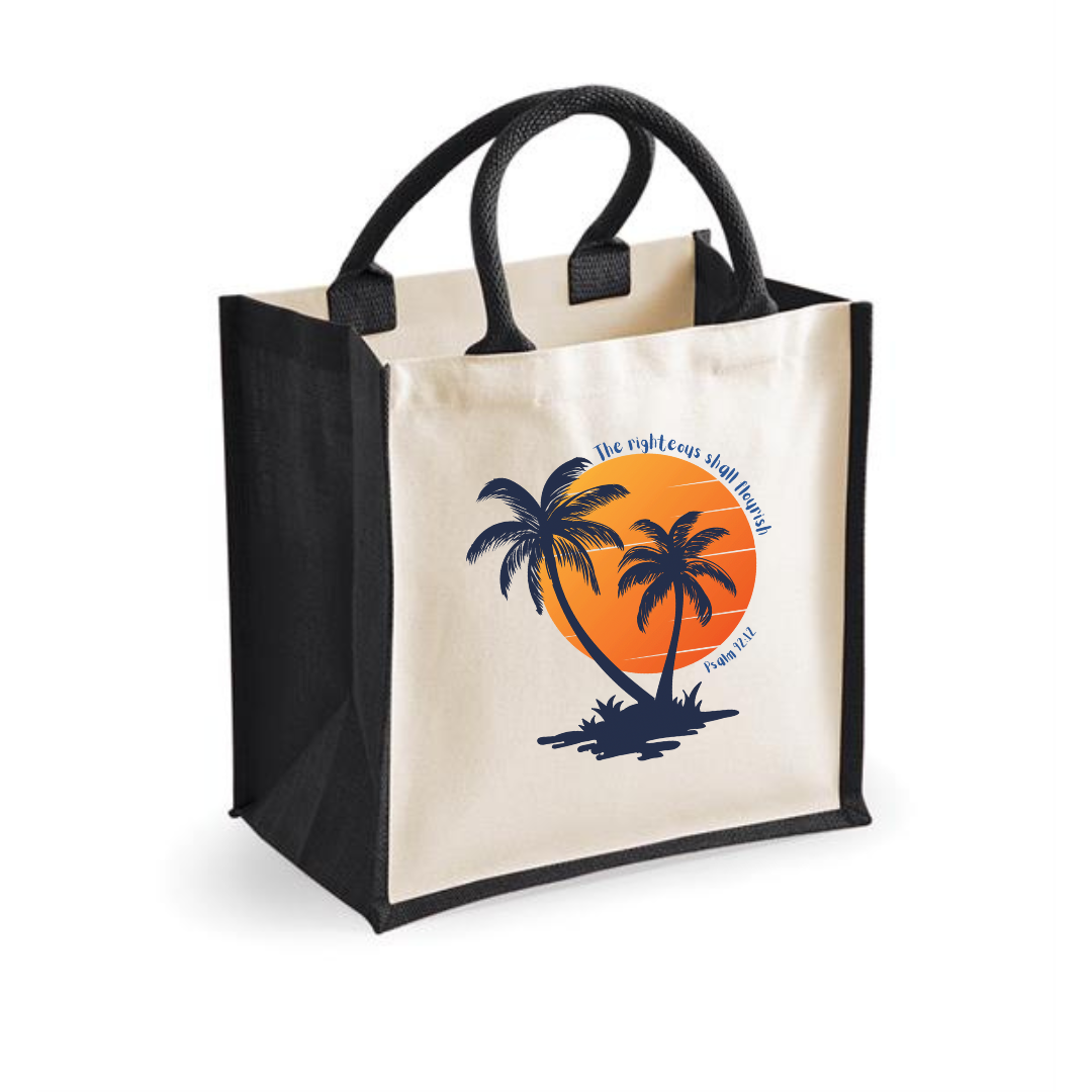 Carry your essentials with style and scripture with our Palm Tree Sunset Jute Canvas Tote Bag, inspired by Psalm 92:12, “The righteous shall flourish like the palm tree.”